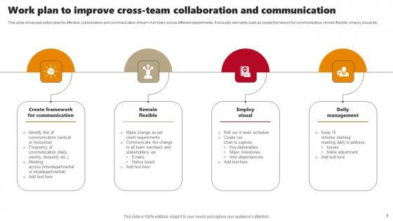 This slide showcase action plan for effective collaboration and communication of team members across different departments. It includes elements such as create framework for communication, remain flexible, employ visual etc. Pitch your topic with ease and precision using this Work Plan To Improve Cross Team Collaboration And Communication Ideas Pdf. This layout presents information on Remain Flexible, Employ Visual, Daily Management. It is also available for immediate download and adjustment. So, changes can be made in the color, design, graphics or any other component to create a unique layout. This slide showcase action plan for effective collaboration and communication of team members across different departments. It includes elements such as create framework for communication, remain flexible, employ visual etc.