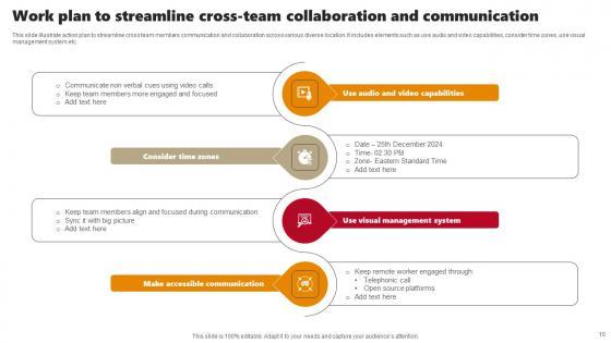 This slide illustrate action plan to streamline cross team members communication and collaboration across various diverse location. It includes elements such as use audio and video capabilities, consider time zones, use visual management system etc. Showcasing this set of slides titled Work Plan To Streamline Cross Team Collaboration And Communication Ideas Pdf. The topics addressed in these templates are Communication, System, Capabilities. All the content presented in this PPT design is completely editable. Download it and make adjustments in color, background, font etc. as per your unique business setting. This slide illustrate action plan to streamline cross team members communication and collaboration across various diverse location. It includes elements such as use audio and video capabilities, consider time zones, use visual management system etc.