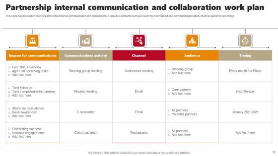 This slide illustrate action plan for partnership internal communication and collaboration. It includes elements such as reason for communications, communication activity channel audience and timing Showcasing this set of slides titled Partnership Internal Communication And Collaboration Work Plan Microsoft Pdf. The topics addressed in these templates are Work Plan, Partnership, Internal. All the content presented in this PPT design is completely editable. Download it and make adjustments in color, background, font etc. as per your unique business setting. This slide illustrate action plan for partnership internal communication and collaboration. It includes elements such as reason for communications, communication activity channel audience and timing