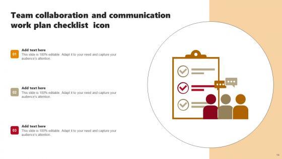 Showcasing this set of slides titled Team Collaboration And Communication Work Plan Checklist Icon Slides Pdf. The topics addressed in these templates are Team Collaboration, Communication, Work. All the content presented in this PPT design is completely editable. Download it and make adjustments in color, background, font etc. as per your unique business setting. Our Team Collaboration And Communication Work Plan Checklist Icon Slides Pdf are topically designed to provide an attractive backdrop to any subject. Use them to look like a presentation pro.