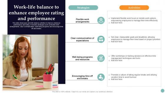 This slide showcases work-life balance activities to improve employee performance and rating. It includes strategies such as flexible work arrangements, clear communication, well-being programs and encourage time off and breaks. Do you know about Slidesgeeks Work Life Balance To Enhance Improving Employee Performance PPT Example Strategy SS V These are perfect for delivering any kind od presentation. Using it, create PowerPoint presentations that communicate your ideas and engage audiences. Save time and effort by using our pre-designed presentation templates that are perfect for a wide range of topic. Our vast selection of designs covers a range of styles, from creative to business, and are all highly customizable and easy to edit. Download as a PowerPoint template or use them as Google Slides themes. This slide showcases work-life balance activities to improve employee performance and rating. It includes strategies such as flexible work arrangements, clear communication, well-being programs and encourage time off and breaks.