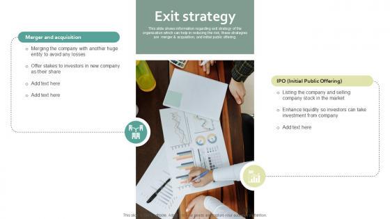This slide shows information regarding exit strategy of the organization which can help in reducing the risk, these strategies are merger and acquisition, and initial public offering. From laying roadmaps to briefing everything in detail, our templates are perfect for you. You can set the stage with your presentation slides. All you have to do is download these easy-to-edit and customizable templates. Exit Strategy Work Management Software Development Organization PPT Presentation will help you deliver an outstanding performance that everyone would remember and praise you for. Do download this presentation today. This slide shows information regarding exit strategy of the organization which can help in reducing the risk, these strategies are merger and acquisition, and initial public offering.