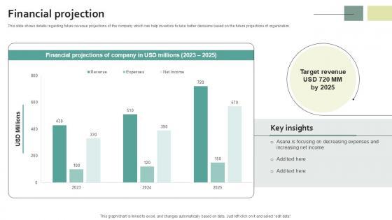 This slide shows details regarding future revenue projections of the company which can help investors to take better decisions based on the future projections of organization. Slidegeeks is here to make your presentations a breeze with Financial Projection Work Management Software Development Organization PPT Template With our easy-to-use and customizable templates, you can focus on delivering your ideas rather than worrying about formatting. With a variety of designs to choose from, you are sure to find one that suits your needs. And with animations and unique photos, illustrations, and fonts, you can make your presentation pop. So whether you are giving a sales pitch or presenting to the board, make sure to check out Slidegeeks first This slide shows details regarding future revenue projections of the company which can help investors to take better decisions based on the future projections of organization.