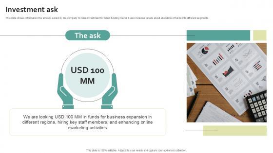 This slide shows information the amount asked by the company to raise investment for latest funding round. It also includes details about allocation of funds into different segments. Find highly impressive Investment Ask Work Management Software Development Organization PPT PowerPoint on Slidegeeks to deliver a meaningful presentation. You can save an ample amount of time using these presentation templates. No need to worry to prepare everything from scratch because Slidegeeks experts have already done a huge research and work for you. You need to download Investment Ask Work Management Software Development Organization PPT PowerPoint for your upcoming presentation. All the presentation templates are 100 percent editable and you can change the color and personalize the content accordingly. Download now This slide shows information the amount asked by the company to raise investment for latest funding round. It also includes details about allocation of funds into different segments.