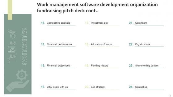 Use this Work Management Software Development Organization Fundraising Pitch Deck Ppt Template to ensure the business world gets to know you as a presentation expert with tremendous recall value. With its focus on providing the worlds best designs to highlight business ideas that have the potential to change the world, this PPT Template is sure to win you clients. The complete deck in thirty two slides is a compendium of information, structured in a manner that provides the best framework for a presentation. Use this completely editable and customizable presentation to make an impact and improve your order book. Download now. Our Work Management Software Development Organization Fundraising Pitch Deck Ppt Template are topically designed to provide an attractive backdrop to any subject. Use them to look like a presentation pro.
