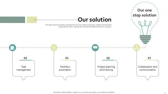 This slide shows information regarding the one stop solution provided by software development organization to track, manage and connect with different teams for a project. Make sure to capture your audiences attention in your business displays with our gratis customizable Our Solution Work Management Software Development Organization PPT PowerPoint. These are great for business strategies, office conferences, capital raising or task suggestions. If you desire to acquire more customers for your tech business and ensure they stay satisfied, create your own sales presentation with these plain slides. This slide shows information regarding the one stop solution provided by software development organization to track, manage and connect with different teams for a project.