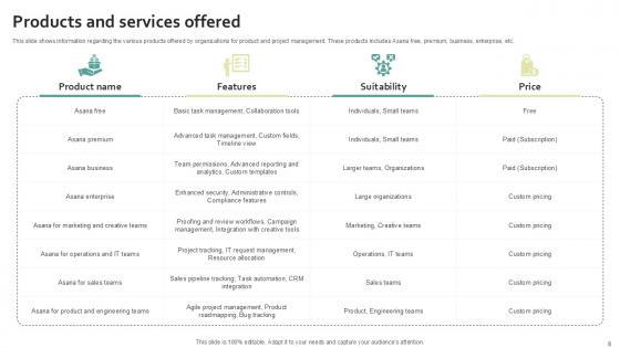 This slide shows information regarding the various products offered by organizations for product and project management. These products includes Asana free, premium, business, enterprise, etc. Coming up with a presentation necessitates that the majority of the effort goes into the content and the message you intend to convey. The visuals of a PowerPoint presentation can only be effective if it supplements and supports the story that is being told. Keeping this in mind our experts created Products And Services Offered Work Management Software Development Organization PPT Sample to reduce the time that goes into designing the presentation. This way, you can concentrate on the message while our designers take care of providing you with the right template for the situation. This slide shows information regarding the various products offered by organizations for product and project management. These products includes Asana free, premium, business, enterprise, etc.