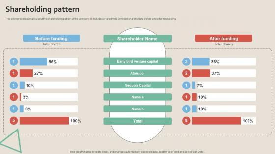 This slide presents details about the shareholding pattern of the company. It includes share divide between shareholders before and after fundraising. This Shareholding Pattern Work Management Tool Pitch Deck is perfect for any presentation, be it in front of clients or colleagues. It is a versatile and stylish solution for organizing your meetings. The Shareholding Pattern Work Management Tool Pitch Deck features a modern design for your presentation meetings. The adjustable and customizable slides provide unlimited possibilities for acing up your presentation. Slidegeeks has done all the homework before launching the product for you. So, do not wait, grab the presentation templates today This slide presents details about the shareholding pattern of the company. It includes share divide between shareholders before and after fundraising.