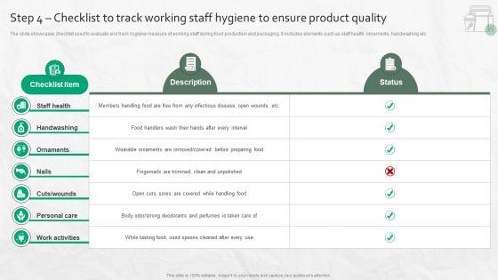The slide showcases checklist used to evaluate and track hygiene measure of working staff during food production and packaging. It includes elements such as staff health, ornaments, handwashing etc. Want to ace your presentation in front of a live audience Our Step 4 Checklist To Track Working Staff Hygiene To Ensure Product Quality can help you do that by engaging all the users towards you. Slidegeeks experts have put their efforts and expertise into creating these impeccable powerpoint presentations so that you can communicate your ideas clearly. Moreover, all the templates are customizable, and easy-to-edit and downloadable. Use these for both personal and commercial use. The slide showcases checklist used to evaluate and track hygiene measure of working staff during food production and packaging. It includes elements such as staff health, ornaments, handwashing etc.