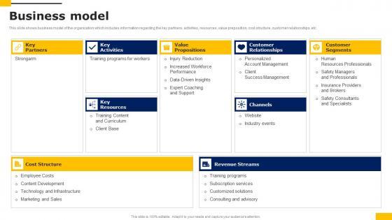 This slide shows business model of the organization which includes information regarding the key partners, activities, resources, value preposition, cost structure, customer relationships, etc. The Business Model Workers Injury Prevention Company Fundraising Pitch Deck Slides Pdf is a compilation of the most recent design trends as a series of slides. It is suitable for any subject or industry presentation, containing attractive visuals and photo spots for businesses to clearly express their messages. This template contains a variety of slides for the user to input data, such as structures to contrast two elements, bullet points, and slides for written information. Slidegeeks is prepared to create an impression. This slide shows business model of the organization which includes information regarding the key partners, activities, resources, value preposition, cost structure, customer relationships, etc.
