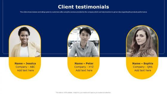 This slide shows reviews and ratings given by customers after using the services provided by the company which can help investors to get an idea regarding the products performance. Are you searching for a Client Testimonials Workers Injury Prevention Company Fundraising Pitch Deck Infographics Pdf that is uncluttered, straightforward, and original Its easy to edit, and you can change the colors to suit your personal or business branding. For a presentation that expresses how much effort you have put in, this template is ideal With all of its features, including tables, diagrams, statistics, and lists, its perfect for a business plan presentation. Make your ideas more appealing with these professional slides. Download Client Testimonials Workers Injury Prevention Company Fundraising Pitch Deck Infographics Pdf from Slidegeeks today. This slide shows reviews and ratings given by customers after using the services provided by the company which can help investors to get an idea regarding the products performance.