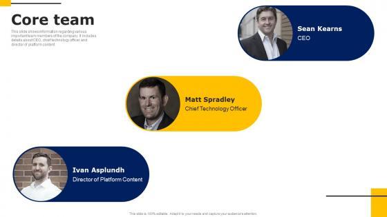 This slide shows information regarding various important team members of the company. It includes details about CEO, chief technology officer and director of platform content. Here you can discover an assortment of the finest PowerPoint and Google Slides templates. With these templates, you can create presentations for a variety of purposes while simultaneously providing your audience with an eye catching visual experience. Download Core Team Workers Injury Prevention Company Fundraising Pitch Deck Topics Pdf to deliver an impeccable presentation. These templates will make your job of preparing presentations much quicker, yet still, maintain a high level of quality. Slidegeeks has experienced researchers who prepare these templates and write high quality content for you. Later on, you can personalize the content by editing the Core Team Workers Injury Prevention Company Fundraising Pitch Deck Topics Pdf. This slide shows information regarding various important team members of the company. It includes details about CEO, chief technology officer and director of platform content.