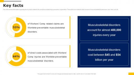 This slide shows information regarding the key facts related to the workplace related injury prevention organization. These facts are related to total number of musculoskeletal injuries every year, their cost, etc. Slidegeeks is one of the best resources for PowerPoint templates. You can download easily and regulate Key Facts Workers Injury Prevention Company Fundraising Pitch Deck Graphics Pdf for your personal presentations from our wonderful collection. A few clicks is all it takes to discover and get the most relevant and appropriate templates. Use our Templates to add a unique zing and appeal to your presentation and meetings. All the slides are easy to edit and you can use them even for advertisement purposes. This slide shows information regarding the key facts related to the workplace related injury prevention organization. These facts are related to total number of musculoskeletal injuries every year, their cost, etc.