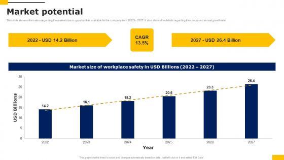 This slide shows information regarding the market size or opportunities available for the company from 2022 to 2027. It also shows the details regarding the compound annual growth rate. There are so many reasons you need a Market Potential Workers Injury Prevention Company Fundraising Pitch Deck Topics Pdf. The first reason is you can not spend time making everything from scratch, Thus, Slidegeeks has made presentation templates for you too. You can easily download these templates from our website easily. This slide shows information regarding the market size or opportunities available for the company from 2022 to 2027. It also shows the details regarding the compound annual growth rate.