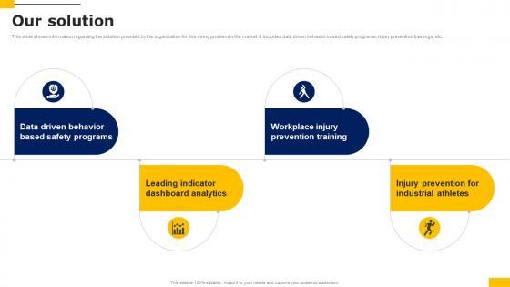 This slide shows information regarding the solution provided by the organization for this rising problem in the market. It includes data driven behavior based safety programs, injury prevention trainings, etc. Get a simple yet stunning designed Our Solution Workers Injury Prevention Company Fundraising Pitch Deck Diagrams Pdf. It is the best one to establish the tone in your meetings. It is an excellent way to make your presentations highly effective. So, download this PPT today from Slidegeeks and see the positive impacts. Our easy to edit Our Solution Workers Injury Prevention Company Fundraising Pitch Deck Diagrams Pdf can be your go to option for all upcoming conferences and meetings. So, what are you waiting for Grab this template today. This slide shows information regarding the solution provided by the organization for this rising problem in the market. It includes data driven behavior based safety programs, injury prevention trainings, etc.