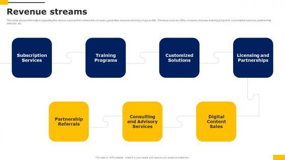 This slide shows information regarding the various sources from where the company generates revenue and enjoy huge profits. Revenue sources of the company includes training programs, subscription services, partnership referrals, etc. Slidegeeks is here to make your presentations a breeze with Revenue Streams Workers Injury Prevention Company Fundraising Pitch Deck Demonstration Pdf With our easy to use and customizable templates, you can focus on delivering your ideas rather than worrying about formatting. With a variety of designs to choose from, you are sure to find one that suits your needs. And with animations and unique photos, illustrations, and fonts, you can make your presentation pop. So whether you are giving a sales pitch or presenting to the board, make sure to check out Slidegeeks first This slide shows information regarding the various sources from where the company generates revenue and enjoy huge profits. Revenue sources of the company includes training programs, subscription services, partnership referrals, etc.