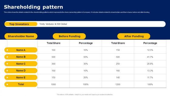 This slide shows the details related to the shareholding patterns which represents the share ownership pattern of company. It includes details related to shareholders and their shares before and after funding Whether you have daily or monthly meetings, a brilliant presentation is necessary. Table Of Contents Workers Injury Prevention Company Fundraising Pitch Deck Slides Pdf can be your best option for delivering a presentation. Represent everything in detail using Table Of Contents Workers Injury Prevention Company Fundraising Pitch Deck Slides Pdf and make yourself stand out in meetings. The template is versatile and follows a structure that will cater to your requirements. All the templates prepared by Slidegeeks are easy to download and edit. Our research experts have taken care of the corporate themes as well. So, give it a try and see the results. This slide shows the details related to the shareholding patterns which represents the share ownership pattern of company. It includes details related to shareholders and their shares before and after funding