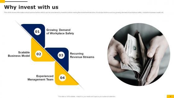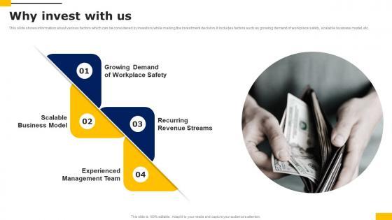 This slide shows information regarding the major value preposition offered by the organization to its customers for better experience. It includes injury reduction, increased workforce performance, etc. If your project calls for a presentation, then Slidegeeks is your go to partner because we have professionally designed, easy to edit templates that are perfect for any presentation. After downloading, you can easily edit Why Invest With Us Workers Injury Prevention Company Fundraising Pitch Deck Mockup Pdf and make the changes accordingly. You can rearrange slides or fill them with different images. Check out all the handy templates This slide shows information regarding the major value preposition offered by the organization to its customers for better experience. It includes injury reduction, increased workforce performance, etc.
