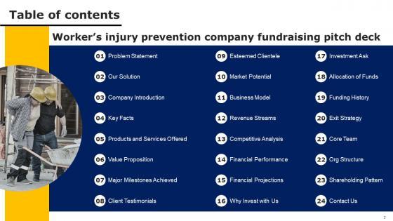Find highly impressive Value Proposition Workers Injury Prevention Company Fundraising Pitch Deck Background Pdf on Slidegeeks to deliver a meaningful presentation. You can save an ample amount of time using these presentation templates. No need to worry to prepare everything from scratch because Slidegeeks experts have already done a huge research and work for you. You need to download Value Proposition Workers Injury Prevention Company Fundraising Pitch Deck Background Pdf for your upcoming presentation. All the presentation templates are 100 percent editable and you can change the color and personalize the content accordingly. Download now Our Table Of Contents Workers Injury Prevention Company Fundraising Pitch Deck Slides Pdf are topically designed to provide an attractive backdrop to any subject. Use them to look like a presentation pro.