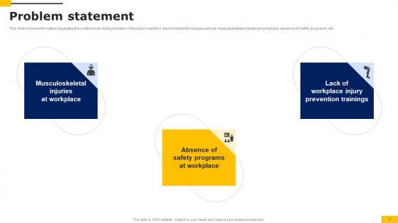 This slide shows information regarding the continuously rising problem in the labor market. It also includes the issues such as musculoskeletal injuries at workplace, absence of safety programs, etc. From laying roadmaps to briefing everything in detail, our templates are perfect for you. You can set the stage with your presentation slides. All you have to do is download these easy to edit and customizable templates. Problem Statement Workers Injury Prevention Company Fundraising Pitch Deck Template Pdf will help you deliver an outstanding performance that everyone would remember and praise you for. Do download this presentation today. This slide shows information regarding the continuously rising problem in the labor market. It also includes the issues such as musculoskeletal injuries at workplace, absence of safety programs, etc.