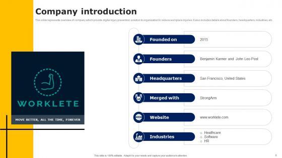 This slide represents overview of company which provide digital injury prevention solution to organization to reduce workplace injuries. It also includes details about founders, headquarters, industries, etc. Retrieve professionally designed Company Introduction Workers Injury Prevention Company Fundraising Pitch Deck Icons Pdf to effectively convey your message and captivate your listeners. Save time by selecting pre made slideshows that are appropriate for various topics, from business to educational purposes. These themes come in many different styles, from creative to corporate, and all of them are easily adjustable and can be edited quickly. Access them as PowerPoint templates or as Google Slides themes. You do not have to go on a hunt for the perfect presentation because Slidegeeks got you covered from everywhere. This slide represents overview of company which provide digital injury prevention solution to organization to reduce workplace injuries. It also includes details about founders, headquarters, industries, etc.