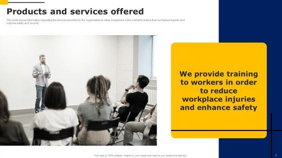 This slide shows information regarding the services provided by the organization to other companies in the market to reduce their workplace injuries and improve safety and security. Present like a pro with Products And Services Offered Workers Injury Prevention Company Fundraising Pitch Deck Guidelines Pdf Create beautiful presentations together with your team, using our easy to use presentation slides. Share your ideas in real time and make changes on the fly by downloading our templates. So whether you are in the office, on the go, or in a remote location, you can stay in sync with your team and present your ideas with confidence. With Slidegeeks presentation got a whole lot easier. Grab these presentations today. This slide shows information regarding the services provided by the organization to other companies in the market to reduce their workplace injuries and improve safety and security.