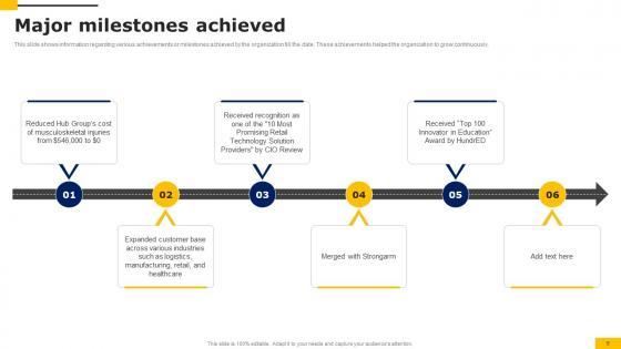 This slide shows information regarding various achievements or milestones achieved by the organization till the date. These achievements helped the organization to grow continuously. Want to ace your presentation in front of a live audience Our Major Milestones Achieved Workers Injury Prevention Company Fundraising Pitch Deck Portrait Pdf can help you do that by engaging all the users towards you. Slidegeeks experts have put their efforts and expertise into creating these impeccable powerpoint presentations so that you can communicate your ideas clearly. Moreover, all the templates are customizable, and easy to edit and downloadable. Use these for both personal and commercial use. This slide shows information regarding various achievements or milestones achieved by the organization till the date. These achievements helped the organization to grow continuously.