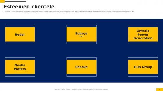 This slide shows information regarding the major business clients of the workplace safety company. The organization has clients in different industries such as logistics manufacturing, retail, etc. This Esteemed Clientele Workers Injury Prevention Company Fundraising Pitch Deck Rules Pdf from Slidegeeks makes it easy to present information on your topic with precision. It provides customization options, so you can make changes to the colors, design, graphics, or any other component to create a unique layout. It is also available for immediate download, so you can begin using it right away. Slidegeeks has done good research to ensure that you have everything you need to make your presentation stand out. Make a name out there for a brilliant performance. This slide shows information regarding the major business clients of the workplace safety company. The organization has clients in different industries such as logistics manufacturing, retail, etc.