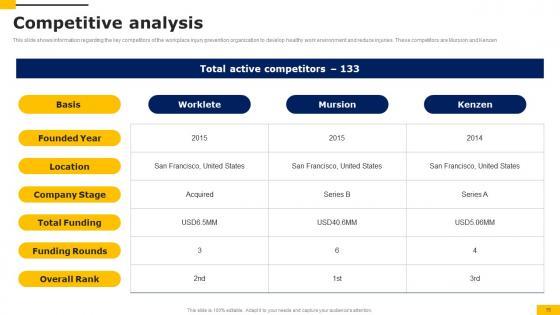 This slide shows information regarding the key competitors of the workplace injury prevention organization to develop healthy work environment and reduce injuries. These competitors are Mursion and Kenzen Slidegeeks has constructed Competitive Analysis Workers Injury Prevention Company Fundraising Pitch Deck Introduction Pdf after conducting extensive research and examination. These presentation templates are constantly being generated and modified based on user preferences and critiques from editors. Here, you will find the most attractive templates for a range of purposes while taking into account ratings and remarks from users regarding the content. This is an excellent jumping off point to explore our content and will give new users an insight into our top notch PowerPoint Templates. This slide shows information regarding the key competitors of the workplace injury prevention organization to develop healthy work environment and reduce injuries. These competitors are Mursion and Kenzen