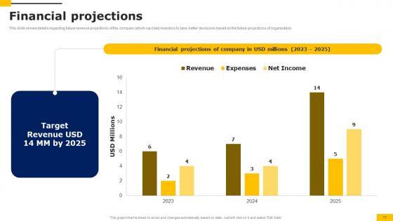 This slide shows details regarding future revenue projections of the company which can help investors to take better decisions based on the future projections of organization. Find a pre designed and impeccable Financial Projections Workers Injury Prevention Company Fundraising Pitch Deck Professional Pdf. The templates can ace your presentation without additional effort. You can download these easy to edit presentation templates to make your presentation stand out from others. So, what are you waiting for Download the template from Slidegeeks today and give a unique touch to your presentation. This slide shows details regarding future revenue projections of the company which can help investors to take better decisions based on the future projections of organization.