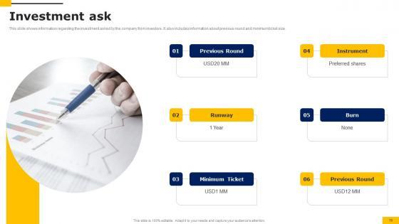 This slide shows information regarding the investment asked by the company from investors. It also includes information about previous round and minimum ticket size. Create an editable Investment Ask Workers Injury Prevention Company Fundraising Pitch Deck Summary Pdf that communicates your idea and engages your audience. Whether you are presenting a business or an educational presentation, pre designed presentation templates help save time. Investment Ask Workers Injury Prevention Company Fundraising Pitch Deck Summary Pdf is highly customizable and very easy to edit, covering many different styles from creative to business presentations. Slidegeeks has creative team members who have crafted amazing templates. So, go and get them without any delay. This slide shows information regarding the investment asked by the company from investors. It also includes information about previous round and minimum ticket size.
