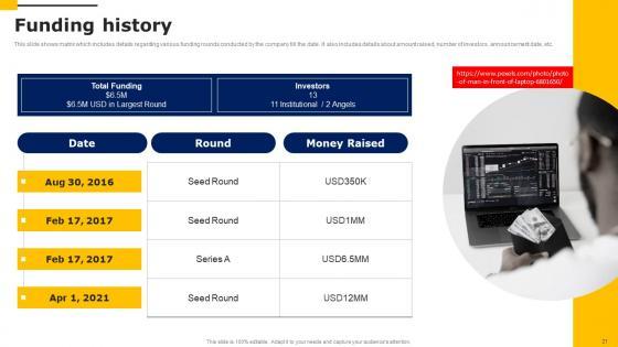 This slide shows matrix which includes details regarding various funding rounds conducted by the company till the date. It also includes details about amount raised, number of investors, announcement date, etc. Boost your pitch with our creative Funding History Workers Injury Prevention Company Fundraising Pitch Deck Introduction Pdf. Deliver an awe inspiring pitch that will mesmerize everyone. Using these presentation templates you will surely catch everyones attention. You can browse the ppts collection on our website. We have researchers who are experts at creating the right content for the templates. So you do not have to invest time in any additional work. Just grab the template now and use them. This slide shows matrix which includes details regarding various funding rounds conducted by the company till the date. It also includes details about amount raised, number of investors, announcement date, etc.
