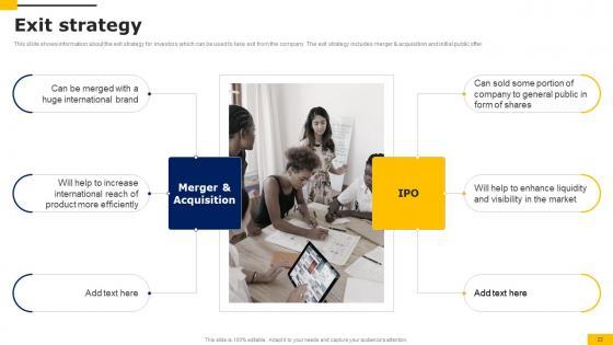 This slide shows information about the exit strategy for investors which can be used to take exit from the company. The exit strategy includes merger and acquisition and initial public offer. qTake your projects to the next level with our ultimate collection of Exit Strategy Workers Injury Prevention Company Fundraising Pitch Deck Guidelines Pdf. Slidegeeks has designed a range of layouts that are perfect for representing task or activity duration, keeping track of all your deadlines at a glance. Tailor these designs to your exact needs and give them a truly corporate look with your own brand colors they will make your projects stand out from the rest This slide shows information about the exit strategy for investors which can be used to take exit from the company. The exit strategy includes merger and acquisition and initial public offer.