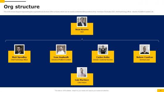 This slide shows diagram representing the organizational structure of the company which can be used to understand the positions of key members. It includes CEO, chief technology officer, director of platform content, etc. Do you have to make sure that everyone on your team knows about any specific topic I yes, then you should give Org Structure Workers Injury Prevention Company Fundraising Pitch Deck Sample Pdf a try. Our experts have put a lot of knowledge and effort into creating this impeccable Org Structure Workers Injury Prevention Company Fundraising Pitch Deck Sample Pdf. You can use this template for your upcoming presentations, as the slides are perfect to represent even the tiniest detail. You can download these templates from the Slidegeeks website and these are easy to edit. So grab these today This slide shows diagram representing the organizational structure of the company which can be used to understand the positions of key members. It includes CEO, chief technology officer, director of platform content, etc.