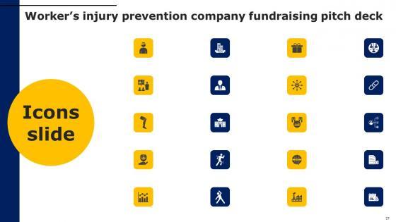 Introducing our well designed Icons Slide Workers Injury Prevention Company Fundraising Pitch Deck Structure Pdf set of slides. The slide displays editable icons to enhance your visual presentation. The icons can be edited easily. So customize according to your business to achieve a creative edge. Download and share it with your audience. Our Icons Slide Workers Injury Prevention Company Fundraising Pitch Deck Structure Pdf are topically designed to provide an attractive backdrop to any subject. Use them to look like a presentation pro.