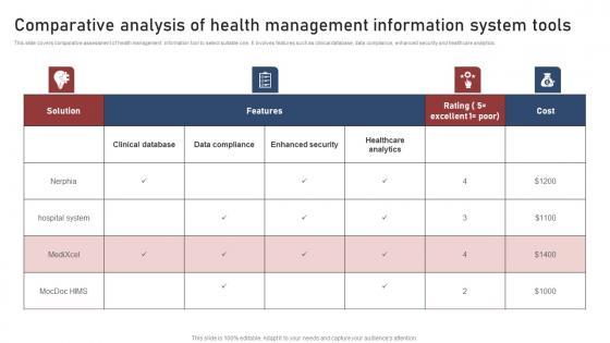 This slide covers comparative assessment of health management information tool to select suitable one. It involves features such as clinical database, data compliance, enhanced security and healthcare analytics. Do you have to make sure that everyone on your team knows about any specific topic I yes, then you should give Comparative Analysis Of Health Transforming Medical Workflows Via His Integration Icons Pdf a try. Our experts have put a lot of knowledge and effort into creating this impeccable Comparative Analysis Of Health Transforming Medical Workflows Via His Integration Icons Pdf. You can use this template for your upcoming presentations, as the slides are perfect to represent even the tiniest detail. You can download these templates from the Slidegeeks website and these are easy to edit. So grab these today This slide covers comparative assessment of health management information tool to select suitable one. It involves features such as clinical database, data compliance, enhanced security and healthcare analytics.