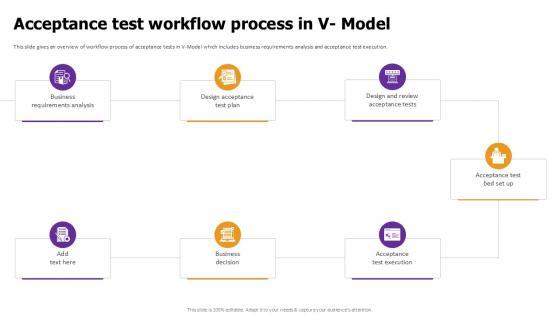 This slide gives an overview of workflow process of acceptance tests in V-Model which includes business requirements analysis and acceptance test execution. Boost your pitch with our creative Acceptance Test Workflow Effective Test Data Management Ppt Slide Deliver an awe-inspiring pitch that will mesmerize everyone. Using these presentation templates you will surely catch everyones attention. You can browse the ppts collection on our website. We have researchers who are experts at creating the right content for the templates. So you do not have to invest time in any additional work. Just grab the template now and use them. This slide gives an overview of workflow process of acceptance tests in V-Model which includes business requirements analysis and acceptance test execution.