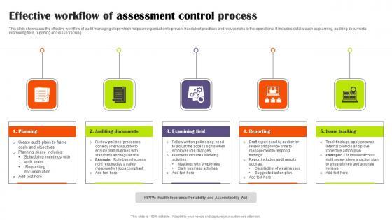 This slide showcases the effective workflow of audit managing steps which helps an organization to prevent fraudulent practices and reduce risks to the operations. It includes details such as planning, auditing documents, examining field, reporting and issue tracking. Showcasing this set of slides titled Effective Workflow Of Assessment Control Process Icons Pdf The topics addressed in these templates are Planning, Auditing Documents, Examining Field, Reporting All the content presented in this PPT design is completely editable. Download it and make adjustments in color, background, font etc. as per your unique business setting. This slide showcases the effective workflow of audit managing steps which helps an organization to prevent fraudulent practices and reduce risks to the operations. It includes details such as planning, auditing documents, examining field, reporting and issue tracking.
