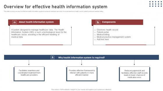 This slide covers overview for effective health information system to enhance medicare services. It involves electronic health record, patient portal and medical billing. Slidegeeks is one of the best resources for PowerPoint templates. You can download easily and regulate Overview For Effective Health Transforming Medical Workflows Via His Integration Infographics Pdf for your personal presentations from our wonderful collection. A few clicks is all it takes to discover and get the most relevant and appropriate templates. Use our Templates to add a unique zing and appeal to your presentation and meetings. All the slides are easy to edit and you can use them even for advertisement purposes. This slide covers overview for effective health information system to enhance medicare services. It involves electronic health record, patient portal and medical billing.
