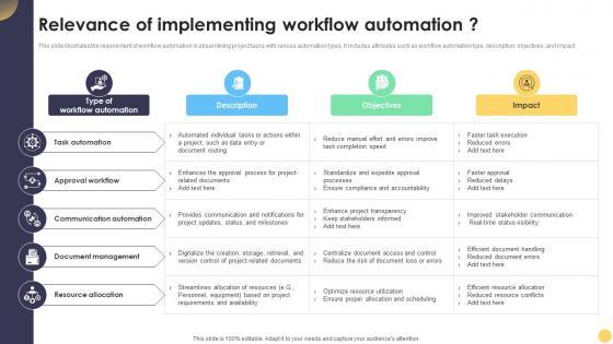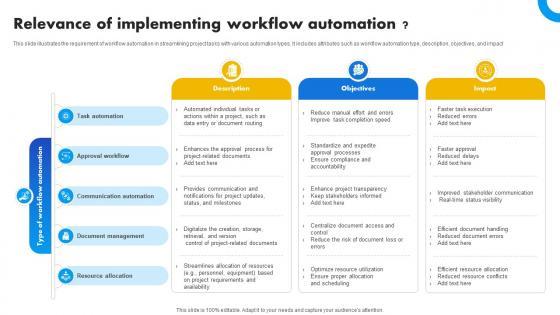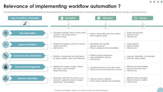 This slide illustrates the requirement of workflow automation in streamlining project tasks with various automation types. It includes attributes such as workflow automation type, description, objectives, and impact. Crafting an eye-catching presentation has never been more straightforward. Let your presentation shine with this tasteful yet straightforward Relevance Of Implementing Workflow Automation Digital Transformation In Project Management template. It offers a minimalistic and classy look that is great for making a statement. The colors have been employed intelligently to add a bit of playfulness while still remaining professional. Construct the ideal Relevance Of Implementing Workflow Automation Digital Transformation In Project Management that effortlessly grabs the attention of your audience Begin now and be certain to wow your customers This slide illustrates the requirement of workflow automation in streamlining project tasks with various automation types. It includes attributes such as workflow automation type, description, objectives, and impact