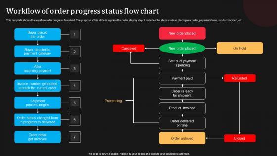 This template shows the workflow order progress flow chart. The purpose of this slide is to place the order step by step. It includes the steps such as placing new order, payment status, product invoiced, etc.Showcasing this set of slides titled Workflow Of Order Progress Status Flow Chart Template Pdf The topics addressed in these templates are Receiving Payment, Payment Gateway, Progress Delivered All the content presented in this PPT design is completely editable. Download it and make adjustments in color, background, font etc. as per your unique business setting. This template shows the workflow order progress flow chart. The purpose of this slide is to place the order step by step. It includes the steps such as placing new order, payment status, product invoiced, etc.