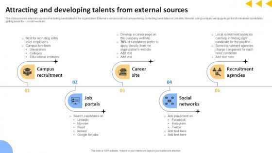 This slide provides external sources of recruiting candidates for the organization. External sources could be campus hiring, contacting candidates on LinkedIn, Monster, using company webpage to get list of interested candidates, getting leads from social media etc. Find highly impressive Workforce Productivity Improvement Attracting And Developing Talents From External Rules Pdf on Slidegeeks to deliver a meaningful presentation. You can save an ample amount of time using these presentation templates. No need to worry to prepare everything from scratch because Slidegeeks experts have already done a huge research and work for you. You need to download Workforce Productivity Improvement Attracting And Developing Talents From External Rules Pdf for your upcoming presentation. All the presentation templates are 100 percent editable and you can change the color and personalize the content accordingly. Download now This slide provides external sources of recruiting candidates for the organization. External sources could be campus hiring, contacting candidates on LinkedIn, Monster, using company webpage to get list of interested candidates, getting leads from social media etc.