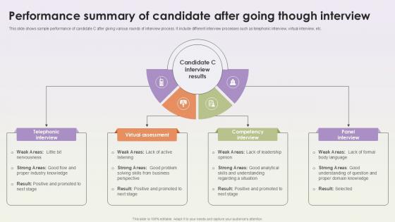 This slide shows sample performance of candidate C after giving various rounds of interview process. It include different interview processes such as telephonic interview, virtual interview, etc. Here you can discover an assortment of the finest PowerPoint and Google Slides templates. With these templates, you can create presentations for a variety of purposes while simultaneously providing your audience with an eye-catching visual experience. Download Performance Summary Of Candidate After Workforce Procurement And Aptitude Evaluation Ppt Presentation to deliver an impeccable presentation. These templates will make your job of preparing presentations much quicker, yet still, maintain a high level of quality. Slidegeeks has experienced researchers who prepare these templates and write high-quality content for you. Later on, you can personalize the content by editing the Performance Summary Of Candidate After Workforce Procurement And Aptitude Evaluation Ppt Presentation. This slide shows sample performance of candidate C after giving various rounds of interview process. It include different interview processes such as telephonic interview, virtual interview, etc.