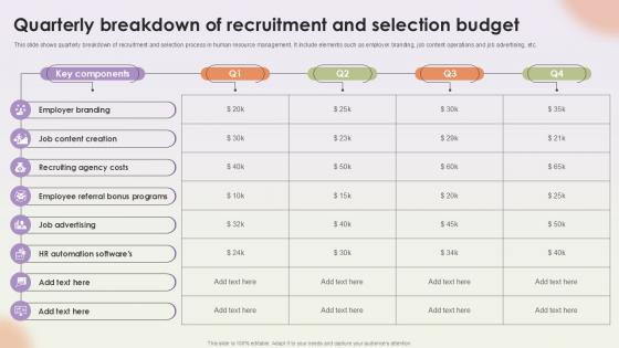 This slide shows quarterly breakdown of recruitment and selection process in human resource management. It include elements such as employer branding, job content operations and job advertising, etc. This Quarterly Breakdown Of Recruitment And Workforce Procurement And Aptitude Evaluation Ppt Presentation from Slidegeeks makes it easy to present information on your topic with precision. It provides customization options, so you can make changes to the colors, design, graphics, or any other component to create a unique layout. It is also available for immediate download, so you can begin using it right away. Slidegeeks has done good research to ensure that you have everything you need to make your presentation stand out. Make a name out there for a brilliant performance. This slide shows quarterly breakdown of recruitment and selection process in human resource management. It include elements such as employer branding, job content operations and job advertising, etc.
