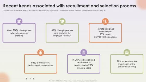 This slide shows current trends related to recruitment and selection industry at global level. It include trends related to automation, online platforms and remote hiring, etc. Take your projects to the next level with our ultimate collection of Recent Trends Associated With Recruitment And Workforce Procurement And Aptitude Evaluation Ppt Example. Slidegeeks has designed a range of layouts that are perfect for representing task or activity duration, keeping track of all your deadlines at a glance. Tailor these designs to your exact needs and give them a truly corporate look with your own brand colors they will make your projects stand out from the rest This slide shows current trends related to recruitment and selection industry at global level. It include trends related to automation, online platforms and remote hiring, etc.