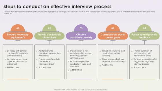 This slide show steps to conduct an effective interview process in organization for selecting suitable candidates. It include steps such as prepare necessary equipments, provide comfortable atmosphere and observe candidate carefully, etc. Want to ace your presentation in front of a live audience Our Steps To Conduct An Effective Interview Process Workforce Procurement And Aptitude Evaluation Ppt Example can help you do that by engaging all the users towards you. Slidegeeks experts have put their efforts and expertise into creating these impeccable powerpoint presentations so that you can communicate your ideas clearly. Moreover, all the templates are customizable, and easy-to-edit and downloadable. Use these for both personal and commercial use. This slide show steps to conduct an effective interview process in organization for selecting suitable candidates. It include steps such as prepare necessary equipments, provide comfortable atmosphere and observe candidate carefully, etc.