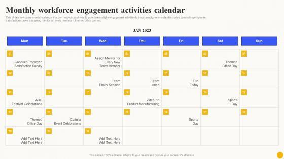 This slide showcases monthly calendar that can help our business to schedule multiple engagement activities to boost employee morale. It includes conducting employee satisfaction survey, assigning mentor for every new team, themed office day, etc. Formulating a presentation can take up a lot of effort and time, so the content and message should always be the primary focus. The visuals of the PowerPoint can enhance the presenters message, so our Monthly Workforce Engagement Activities Calendar Staff Management Approache Topics Pdf was created to help save time. Instead of worrying about the design, the presenter can concentrate on the message while our designers work on creating the ideal templates for whatever situation is needed. Slidegeeks has experts for everything from amazing designs to valuable content, we have put everything into Monthly Workforce Engagement Activities Calendar Staff Management Approache Topics Pdf This slide showcases monthly calendar that can help our business to schedule multiple engagement activities to boost employee morale. It includes conducting employee satisfaction survey, assigning mentor for every new team, themed office day, etc.