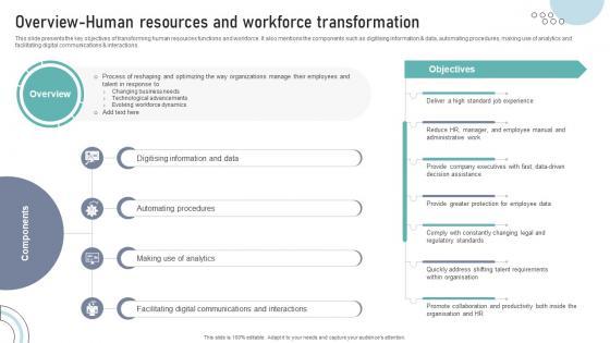 This slide presents the key objectives of transforming human resources functions and workforce. It also mentions the components such as digitising information and data, automating procedures, making use of analytics and facilitating digital communications and interactions.Coming up with a presentation necessitates that the majority of the effort goes into the content and the message you intend to convey. The visuals of a PowerPoint presentation can only be effective if it supplements and supports the story that is being told. Keeping this in mind our experts created Overview Human Resources And Workforce Transformation DT SS V to reduce the time that goes into designing the presentation. This way, you can concentrate on the message while our designers take care of providing you with the right template for the situation. This slide presents the key objectives of transforming human resources functions and workforce. It also mentions the components such as digitising information and data, automating procedures, making use of analytics and facilitating digital communications and interactions.