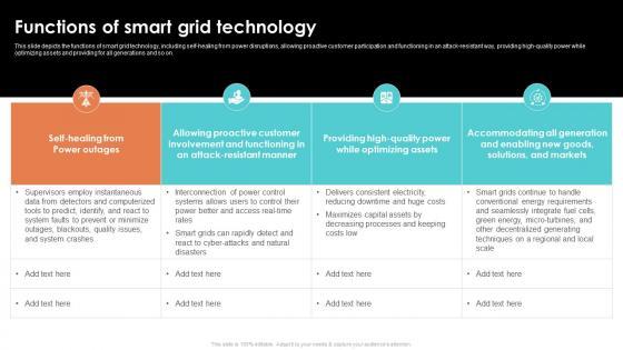 This slide depicts the functions of smart grid technology, including self healing from power disruptions, allowing proactive customer participation and functioning in an attack resistant way, providing high quality power while optimizing assets and providing for all generations and so on. Present like a pro with Functions Of Smart Grid Technology Smart Grid Working Create beautiful presentations together with your team, using our easy to use presentation slides. Share your ideas in real time and make changes on the fly by downloading our templates. So whether you are in the office, on the go, or in a remote location, you can stay in sync with your team and present your ideas with confidence. With Slidegeeks presentation got a whole lot easier. Grab these presentations today. This slide depicts the functions of smart grid technology, including self healing from power disruptions, allowing proactive customer participation and functioning in an attack resistant way, providing high quality power while optimizing assets and providing for all generations and so on.