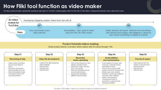 This slide provides information regarding Fliki operating as video maker for YouTube in creating engaging videos from text with AI. It also helps in creating product tutorials or demo videos with AI voices. This How Fliki Tool Function As Video Maker How Generative AI Tools Work AI SS V from Slidegeeks makes it easy to present information on your topic with precision. It provides customization options, so you can make changes to the colors, design, graphics, or any other component to create a unique layout. It is also available for immediate download, so you can begin using it right away. Slidegeeks has done good research to ensure that you have everything you need to make your presentation stand out. Make a name out there for a brilliant performance. This slide provides information regarding Fliki operating as video maker for YouTube in creating engaging videos from text with AI. It also helps in creating product tutorials or demo videos with AI voices.